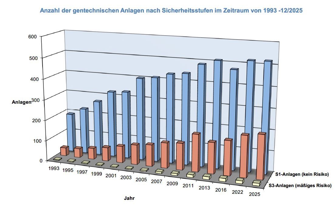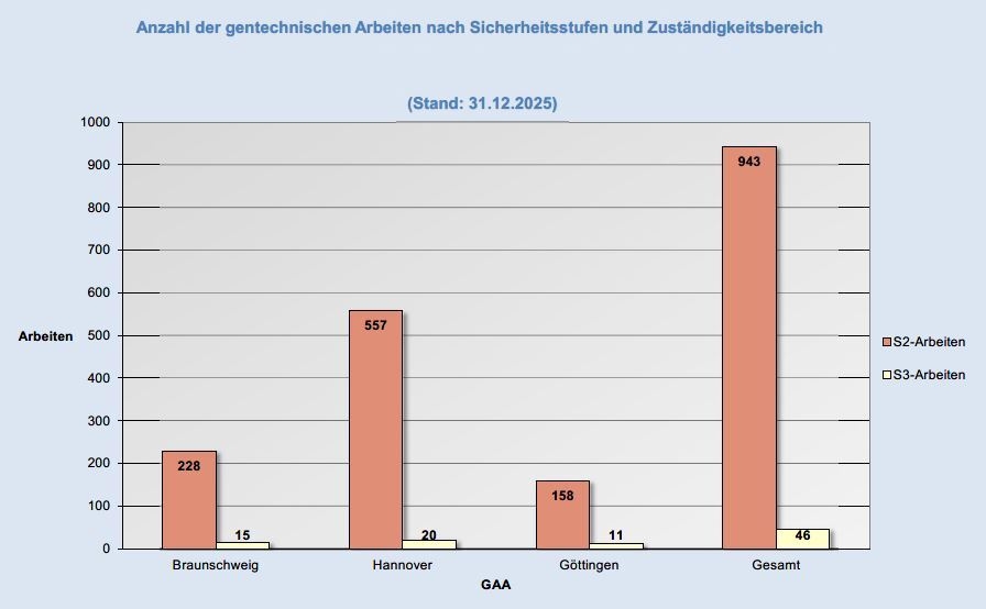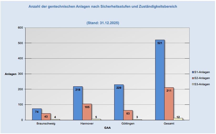 In den letzten Jahren stieg in Niedersachsen die Anzahl gentechnischer Anlagen kontinuierlich an. So sind aktuell über 700 gentechnische Anlagen in Betrieb. Im größten Teil dieser Anlagen (>70%) werden gentechnische Arbeiten der Sicherheitsstufe 1 durchgeführt, in knapp30% der Anlagen Arbeiten der Sicherheitsstufe 2 und in etwa 2% der Anlagen Arbeiten der Sicherheitsstufe 3.