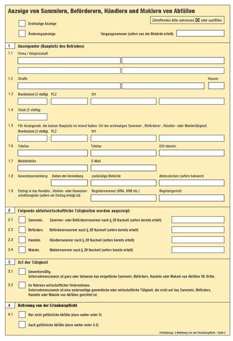 Nach dem Kreislaufwirtschaftsgesetz (KrWG) haben ab dem 01.06.2012 Sammler, Beförderer, Händler und Makler von Abfällen die Tätigkeit ihres Betriebes vor Aufnahme der Tätigkeit der zuständigen Behörde anzuzeigen. Ab dem 01.06.2014 gilt dies auch für Sammler und Beförderer, die Abfälle im Rahmen wirtschaftlicher Unternehmen sammeln oder befördern.